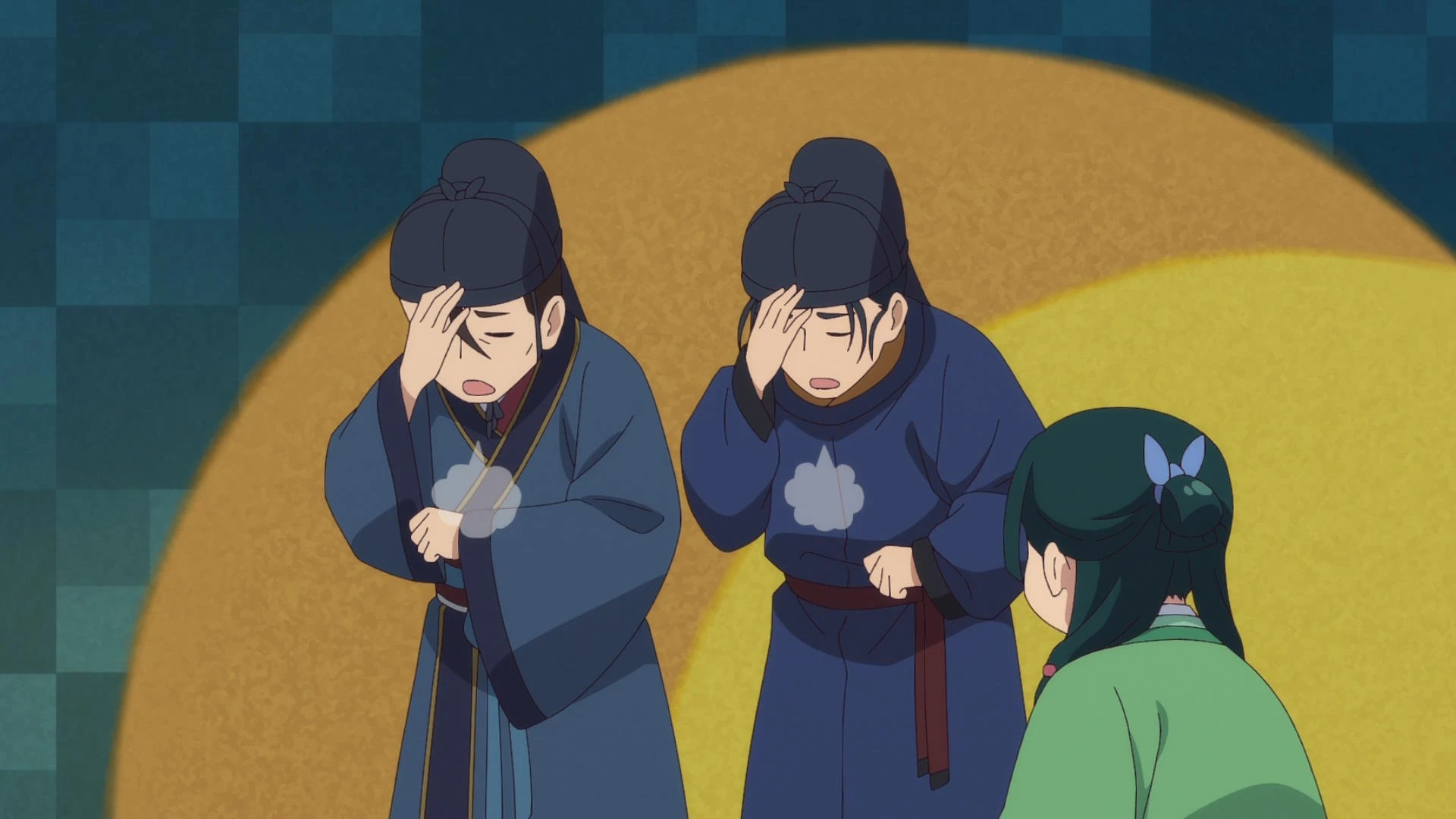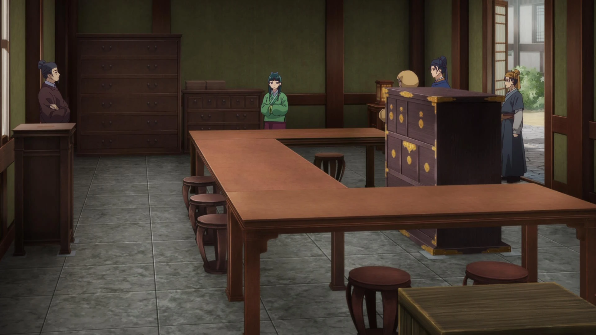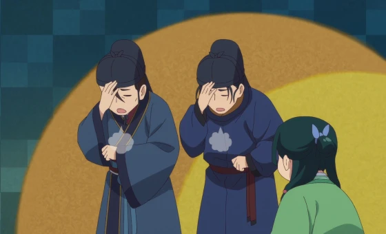 Женьши обращается за помощью к Маомао. Дело в том, что недавно к нему самому с той же просьбой пришел Лаохань — умнейшая ищейка Его Величества. И повел рассказ о том, каким способом сбил цену одной из лучших и дорогих куртизанок Медяного Дома, пытаясь выкупить ее из рабства. Но так и не довершил свой рассказ, повесив в воздухе его главный элемент. И чтобы выдать секрет сделки, взамен он попросил Женьши разобраться с одним дельцем. А именно: выяснить, что написано в дневнике кузнеца-ювелира, который недавно почил, но не оставил секрет своего мастерства ни одному из трех сыновей-подмастерьев. А вот заветный дневничок кузнеца может хранить эту тайну. Проблема в том, что вообще неясно, что там написано. То ли это нарочно сделанный шифр, то ли просто белиберда, но разобраться стоит. Собственно, такое задание получает наша Маомао. А, вот еще что. В конце завещания старик оставил такое сообщение: «Сыновья мои. Когда вашего отца не станет, мой старший сын получит мастерскую, средний — дорогую мебель, а младший — стеклянный аквариум, а чтобы вы не рассорились, хочу наказать вам провести чаепитие, как это было в старые-добрые времена». Загвоздка в том, что никто из сыновей не знает, о каком чаепитие вообще идет речь. Само собой, это загадочное дело заинтересовало нашу героиню. Получив адрес мастерской, она навострила ноги туда.