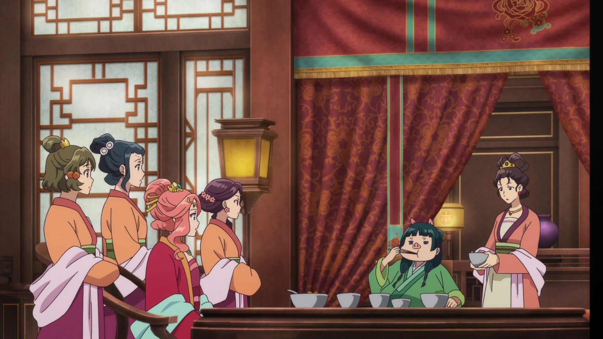 Маомао «получила свое». Разок помогла любимой наложнице императора и сразу стала ее фавориткой. «В чем же проблема?» — можете спросить вы. Так вот я отвечу, что Маомао очень комфортно сиделось на своей ма-а-а-аленькой должности — «низшей» служанки, — а теперь ее ждут прямо в Нефритовом Дворце. Это то же самое, как, будучи рядовым автомехаником, починить машину жены президента и переехать жить в их особняк, работая там личным автомехаником у настолько высокопоставленной семьи. Ответственности — лучше увольте!