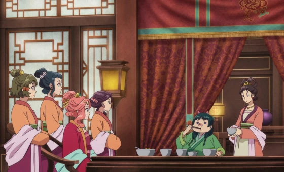 А тем временем наша героиня прибывает в тот самый дворец. Встречает ее старшая служанка госпожи Гекуе, имя которой Хон-нян. И ведет не просто ознакамливать с новыми задачами на престижной должности, а прямиком в покои Госпожи. Ну а уж после, увидев «начальство» в лицо, для Маомао будет проведена экскурсия, чтобы она знала, где потчуют гостей, где для них готовят еду, а где… кхе-кхе… находится отхожее место. Затем ее уведут знакомить точно с такими же служанками. Но едва они успеют сказать, как их зовут, как тут же накинутся на новенькую и чуть ли не силой попытаются отправить ее в спальню — чтобы та набиралась сил. Ведь совсем скоро ее будут ждать «особые» поручения госпожи Гекуе.