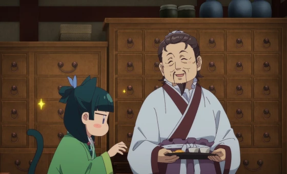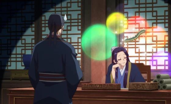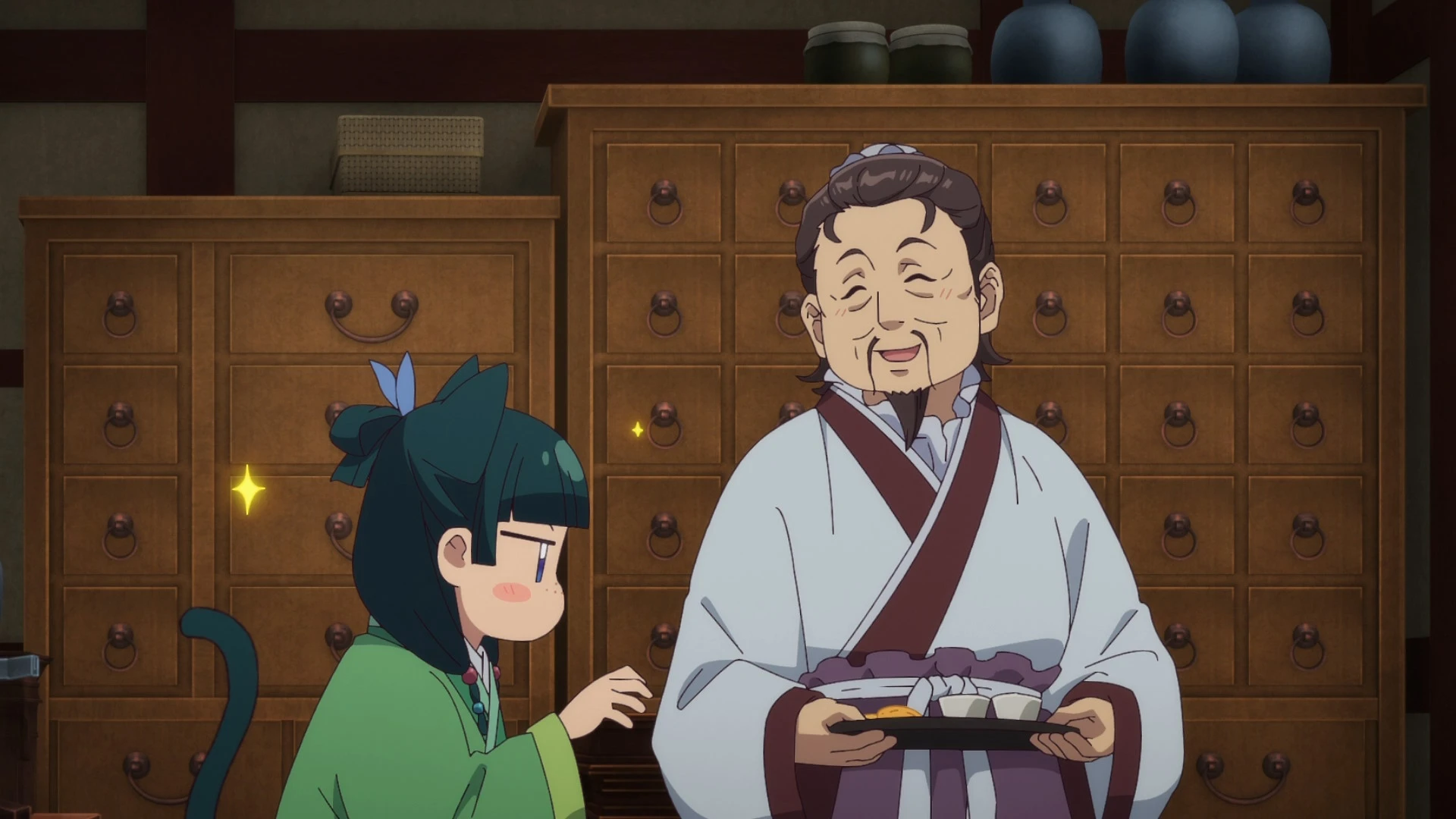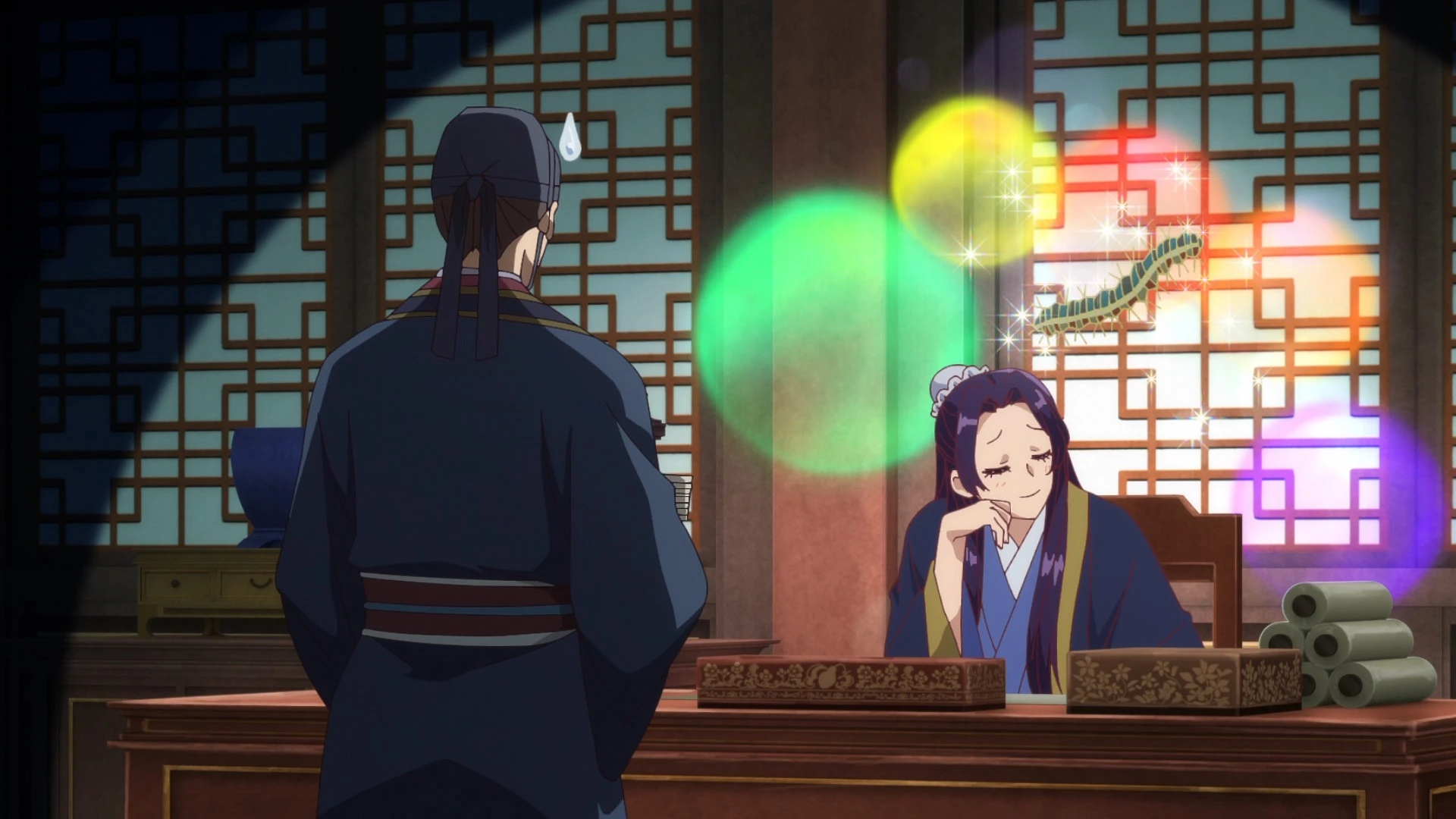 А вот и фольклорчик подъехал. По Внутреннему двору, среди евнухов, служанок и наложниц, стали ходить слухи о призраке в белом, который бродит здесь по ночам, а перед тем, как растворится в воздухе, вытанцовывает пируэты на восточной стене. Об этом с Маомао поделилась Инхуа. А уже ближе к полудню, закончив свою работу, наша героиня идет в медицинский кабинет за травами. Там ее встречает Доктор-шарлатан, который ни с того ни с сего вдруг улыбается гостье. (С чего бы?). Может быть, он изменил свое отношение, узнав, что обычная служанка теперь значится как личная травница «жены» Императора? А может и нет. В любом случае теперь он угощает ее чаем и рисовыми коврижками. Вот только на это раз вместо любимых коврижек лежат лавандовые крекеры. Печально… Ведь это значит, что чаепитие отменяется, а угощение предназначается для Женьши. Кстати, а вот и он.